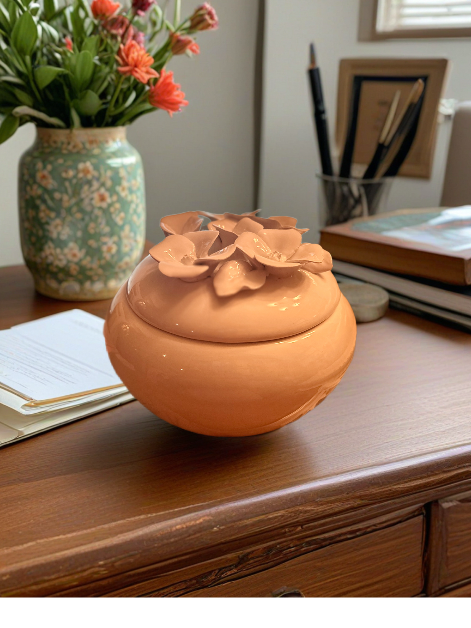 Add a touch of elegance to your home with our White Ceramic Petal Bowl with Lid. This bowl is stylish and functional and has a beautifully crafted design with delicate petal details. Perfect as a candle or displayed as a decorative piece, its charming lid keeps contents secure while enhancing its floral-inspired look. A timeless addition to any space!